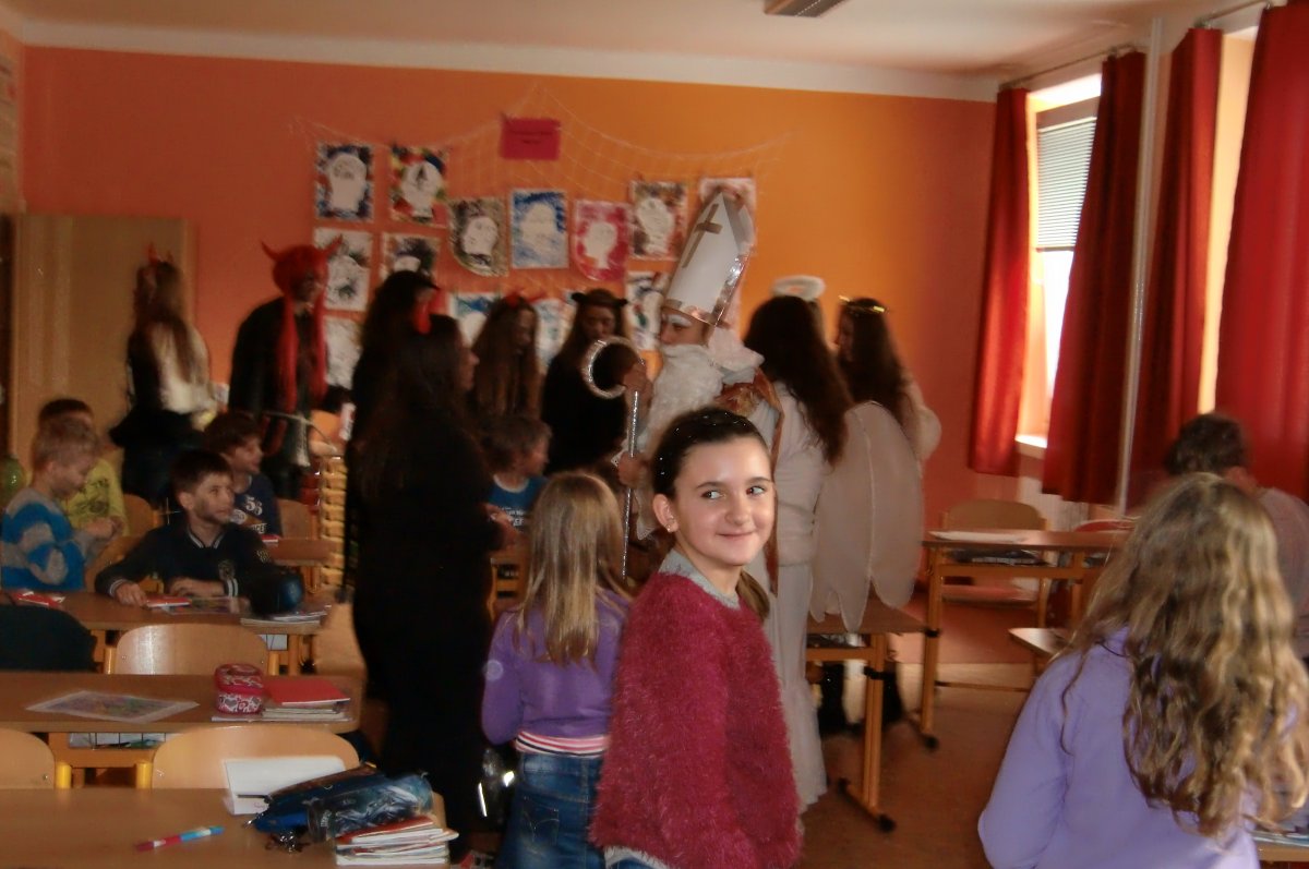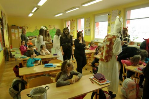 Žáci 1. stupně se v pátek 4. prosince od rána těšili, někteří se báli, ale radost z příchodu Mikuláše, anděla a čertic byla větší. A jak to bývá, nepřišli s prázdnou. Mikuláš rozdal všem dětem balíčky se sladkostmi i ovocem, a čerticím žádný zlobivý žáček v pytli nezůstal.